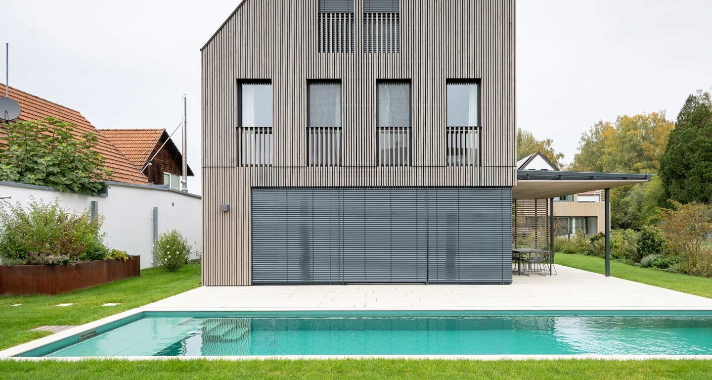 Der naturnahe Wasserlauf, angelehnt an einen kleinen Gebirgsbach, verbindet das offene Wohnhaus mit dem blauen Bodensee. Das Wasser plätschert gemütlich vor sich hin, so beschaulich wie eine Schifffahrt nach Stein am Rhein. Die große Pergola überdeckt mit Kastanienholz verleiht lauen Sommerabenden einen besonderen Charme und lädt zum Verweilen und Feiern ein. Verschiedene Gräser betonen die Nähe zum See, sie schmiegen sich wie gewollt in die Uferlandschaft ein.