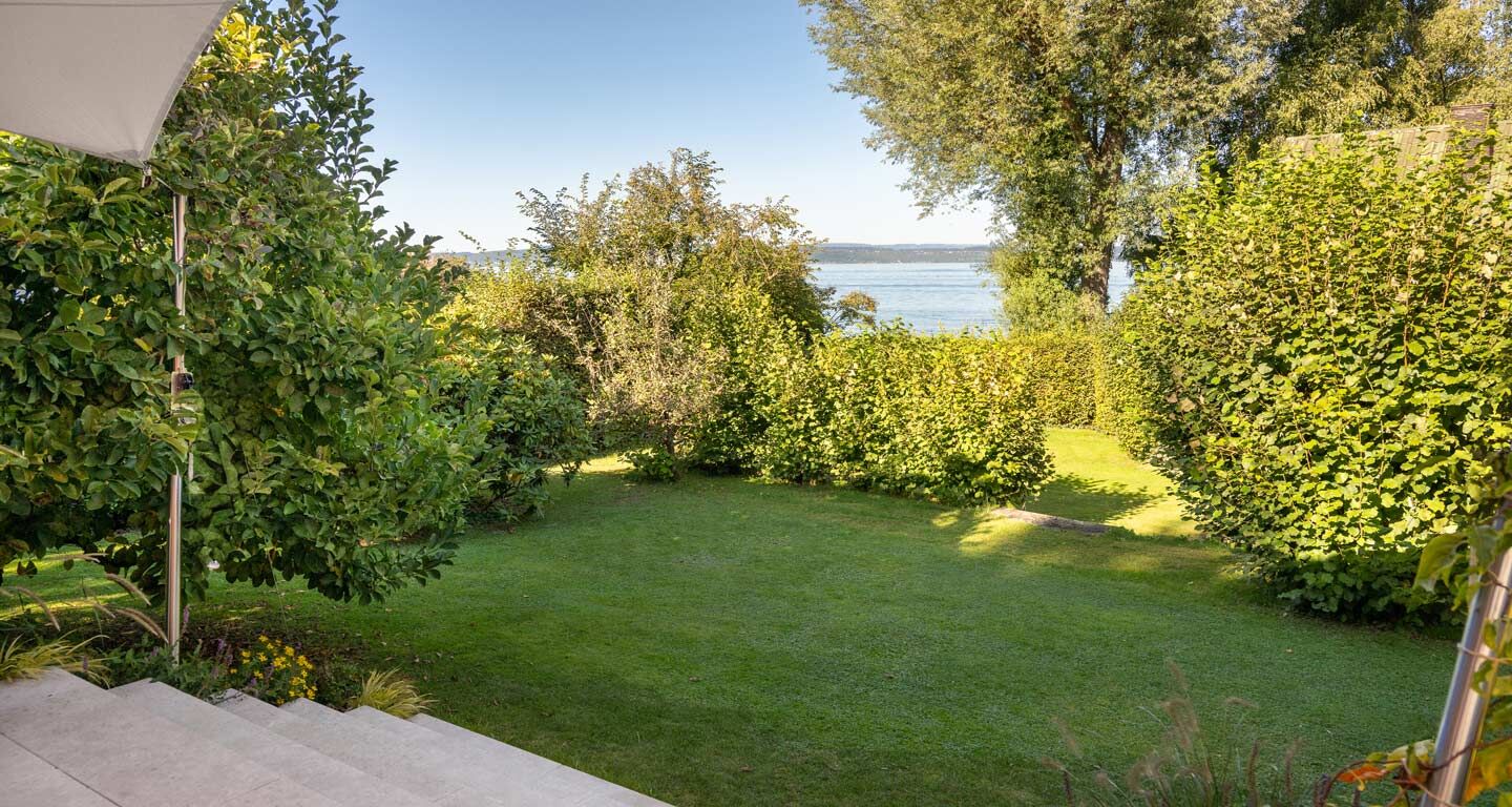 Die Stufen öffnen die Terrasse Richtung See. Es war ein Glück, dieses Haus in der Lage – spontan gefunden und spontan verliebt. Der See gehört wie selbstverständlich dazu, er weitet den Blick in die wunderschöne Landschaft. Großzügige helle Platten aus Travertin bringen Licht und werden gerahmt von fröhlichen Stauden. So ist Geborgenheit.