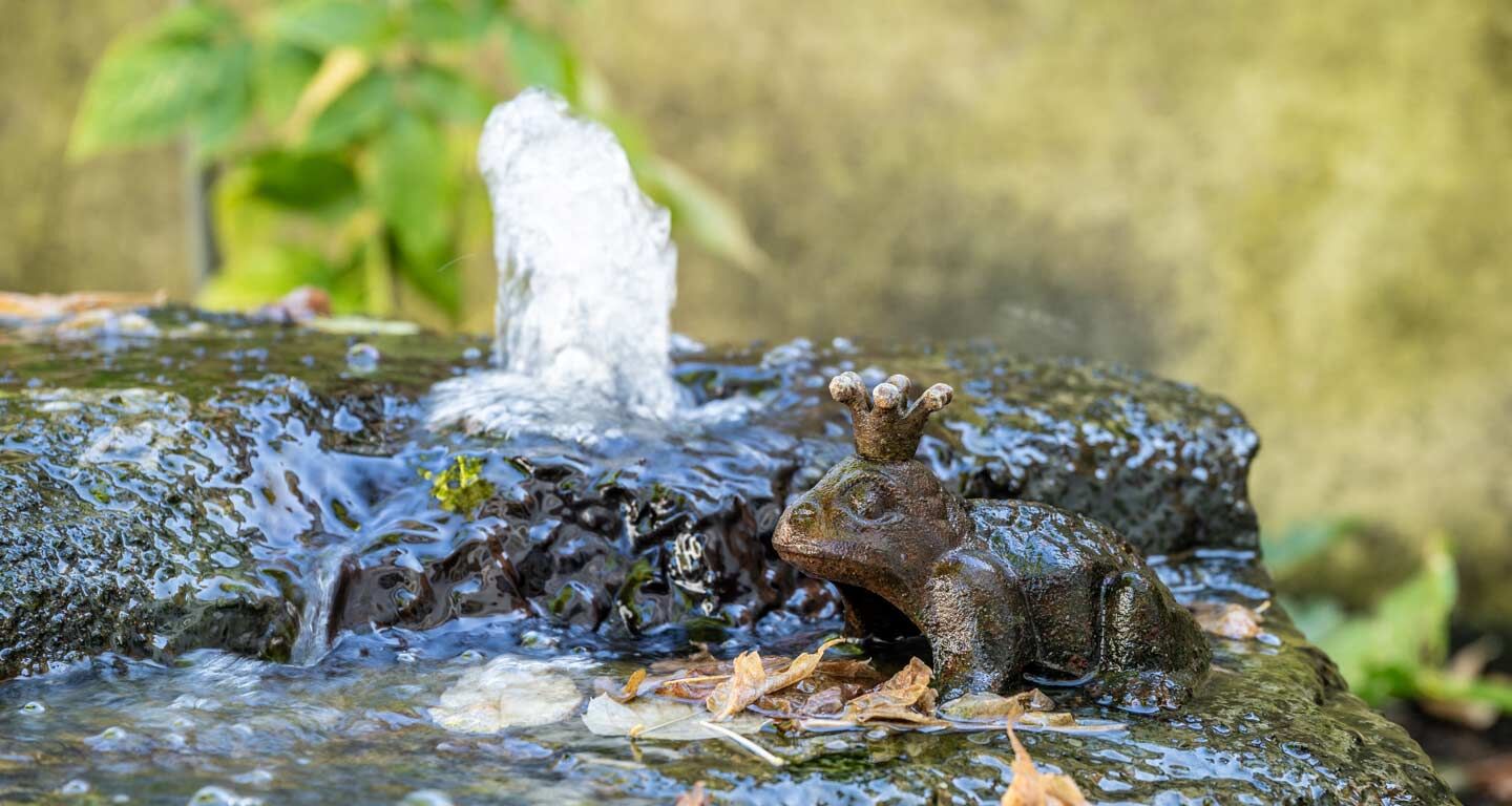 Über den Quellstein fließt das Wasser sanft entlang der Gestehung. Jeder Einschluss im Gestein hat seine jahrtausendlange Geschichte. Angesichts dessen wird der Klang des Wassers zu einer Quelle der Gewissheit, dass Einsicht aus dem Innern kommt.